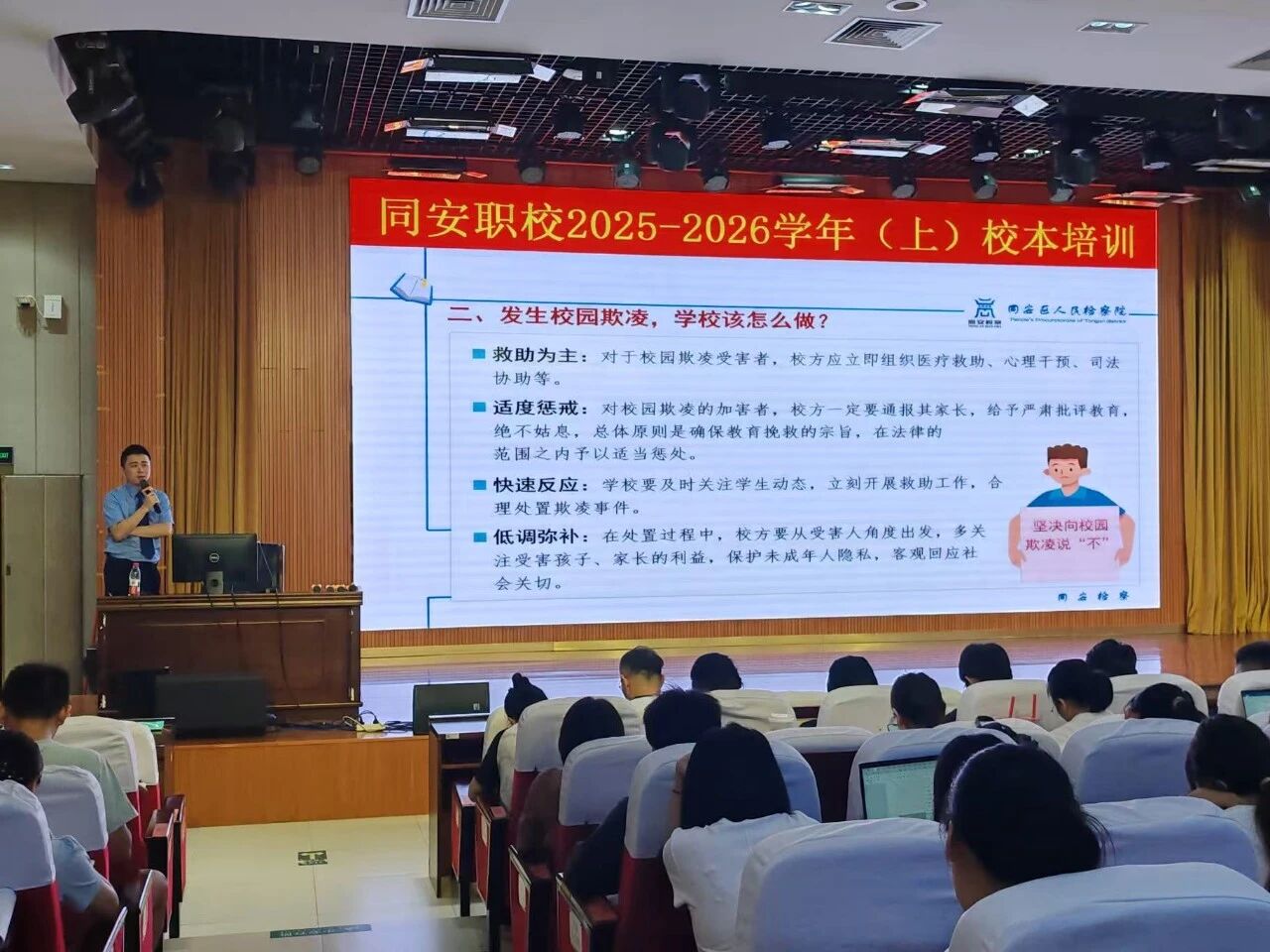 近日,同安区检察院“同心未爱”团队走进校园开展“开学第一课”活动,在厦门市五显中学,检察干警为600名高一新生带来“守护青春,安全触网”主题网络犯罪预防宣讲,课堂上,检察干警结合真实案例,生动剖析网络侵害与网络犯罪的常见形式,帮助同学们筑牢防线。在同安实验中学和同安职业技术学校,检察干警分别为500名学生和300名教师开展预防校园欺凌专题宣讲,以真实案例切入,为大家敲响警钟,同时结合校园欺凌多种具体表现向学校提出切实可行的防欺凌指导。